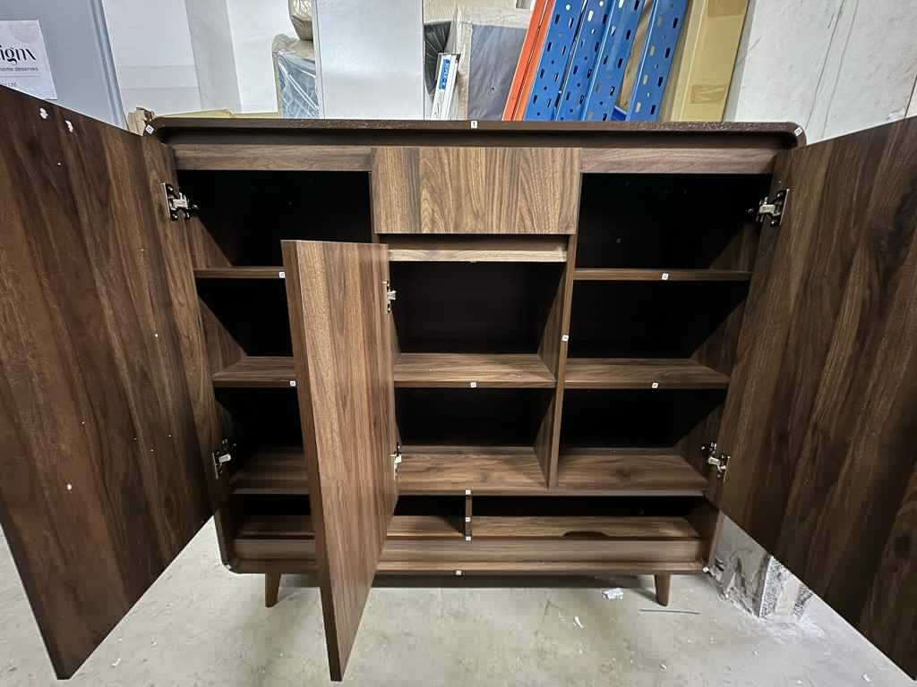 Built from high-quality particle board and supported by sturdy solid wood legs, this walnut shoe cabinet offers long-lasting durability and a clean, modern look. Its configuration includes three doors and two drawers, plus a hidden shelf at the bottom — ideal for keeping shoes, accessories, or personal items neatly tucked away.
